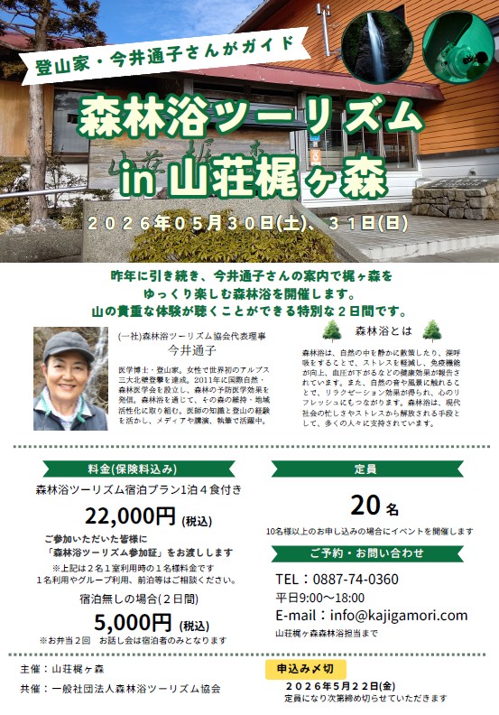 当協会代表の今井通子とともに梶ヶ森を歩く特別な森林浴イベントを開催します。